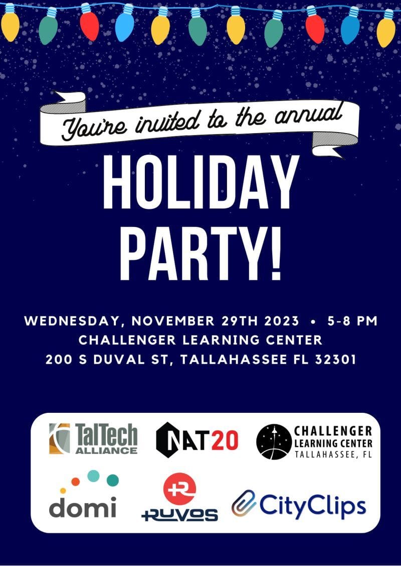 Nov. 29th, Wed. 5 PM to 8 PM EST at Challenger Learning Center: TalTech Alliance Holiday Party. We hope to see you there! | More Event Info. | RSVP via Zeffy