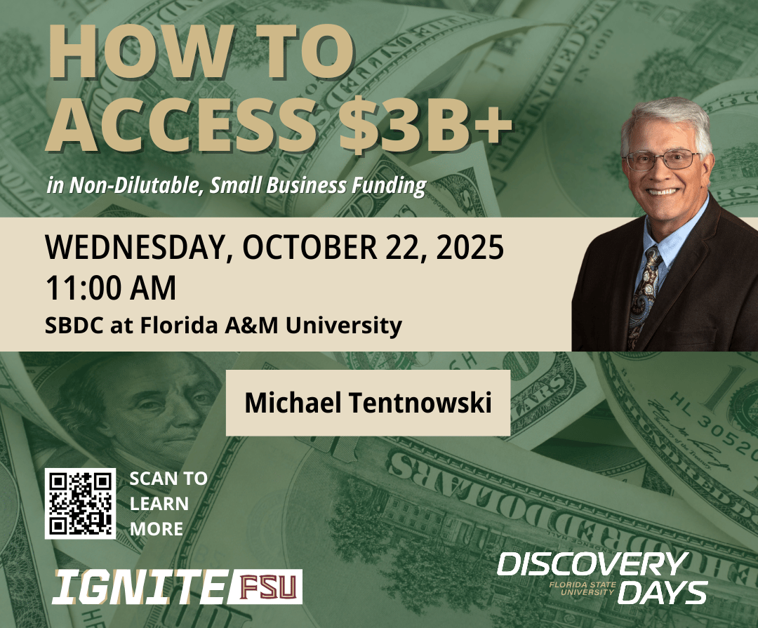Featured Event: How to Access $3B+ in Non-Dilutable, Small Business Funding | Wednesday, Oct. 22 | 11 AM | Florida SBDC at FAMU, 625 E. Tennessee St. | Register