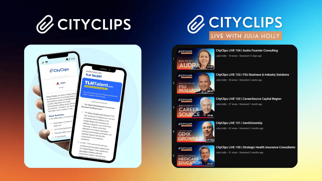 We go beyond the inbox. While newsletters are our roots, CityClips Live streams episodes on topics from building newsletters to conversations with local entrepreneurs, executives, innovators, and community leaders making a real impact in Tallahassee and beyond.