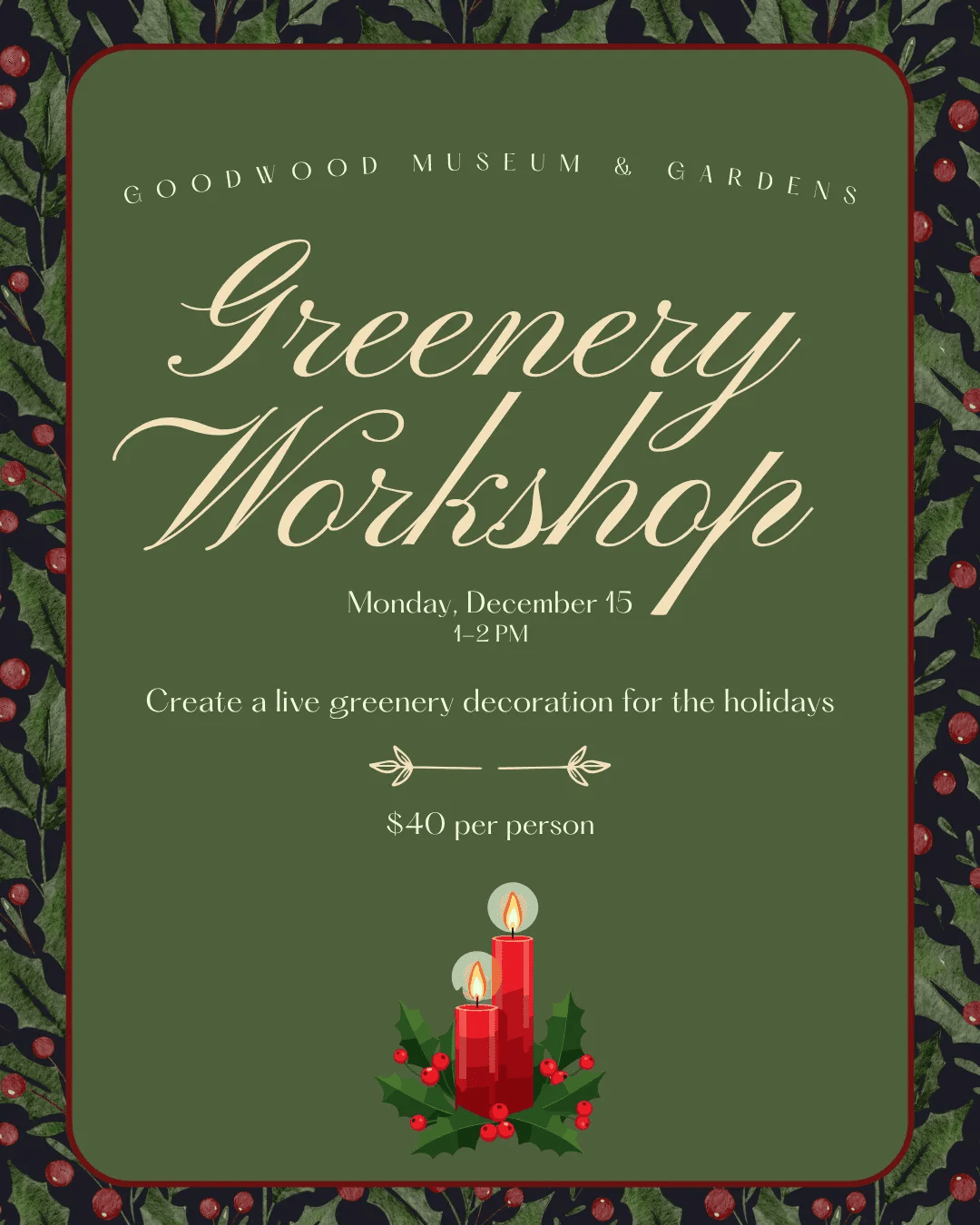 Featured Event: Holiday Greenery Workshop by Goodwood Museum and Gardens | Monday, Dec. 15 | 1 PM | Goodwood Museum and Gardens, 1600 Miccosukee Rd. | $44.52 including fees Tickets | Learn More
