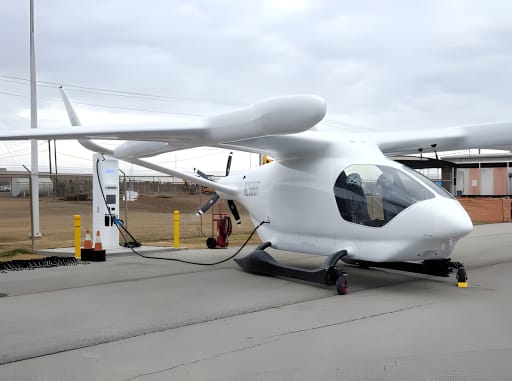 Archer’s Midnight aircraft looks more like a small electric plane with multiple rotors. It carries up to four passengers plus a pilot, produces less noise than helicopters, and is designed to be neighborhood-friendly while performing frequent short flights. ✈️